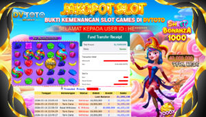 Selamat kepada User id : HE***** Telah berhasil mendapatkan kemenangan besar pada permainan SWEET BONANZA 1000  Kemenangan Sebesar Rp. 40,000,000,- Setelah mengisi formulir withdraw dengan kurung waktu hanya 5 – 10 menit pihak dvtoto sudah melakukan transfer kepada pemilik Userid dan dana sudah dapat di cairkan oleh pemenang. Bukti pembayaran yang kami berikan merupakan bukti pembayaran yang SAH / VALID yang langung di dapatkan melaui tanda transfer transaksi dari Bank yang di tuju.