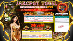 Selamat kepada User id : UM**** Telah berhasil mendapatkan kemenangan besar pada permainan TOGEL TOTO MACAU 5D Kemenangan Sebesar Rp. 9.400.000,- Setelah mengisi formulir withdraw dengan kurung waktu hanya 5 – 10 menit pihak dvtoto sudah melakukan transfer kepada pemilik Userid dan dana sudah dapat di cairkan oleh pemenang. Bukti pembayaran yang kami berikan merupakan bukti pembayaran yang SAH / VALID yang langung di dapatkan melaui tanda transfer transaksi dari Bank yang di tuju.